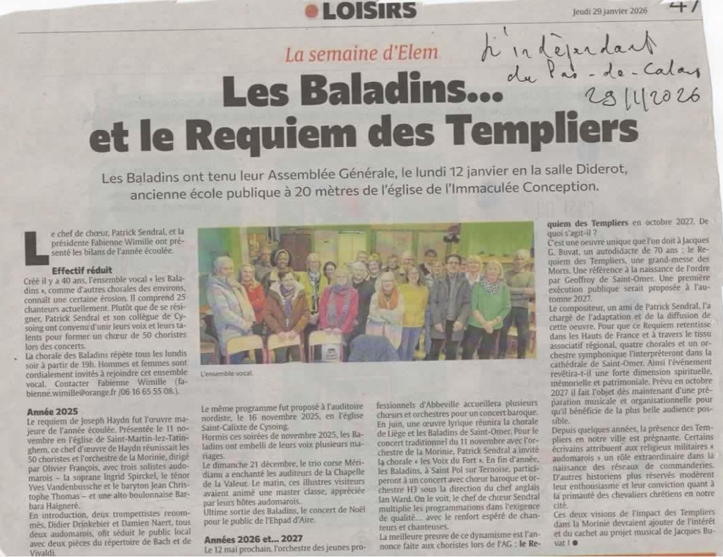 07/02/2026. Notre chorale est invitée à participer à deux grands projets de concerts avec le chœur les Baladins de Saint Omer. Le premier le 11 novembre 2026 avec l’orchestre de la Morinie. Le second en 2027 avec 4 chorales et un orchestre symphonique… A suivre…